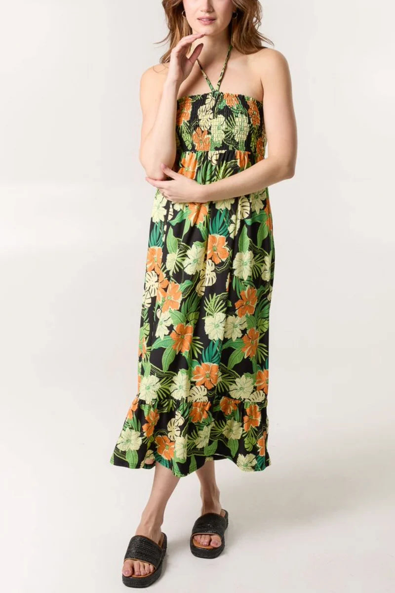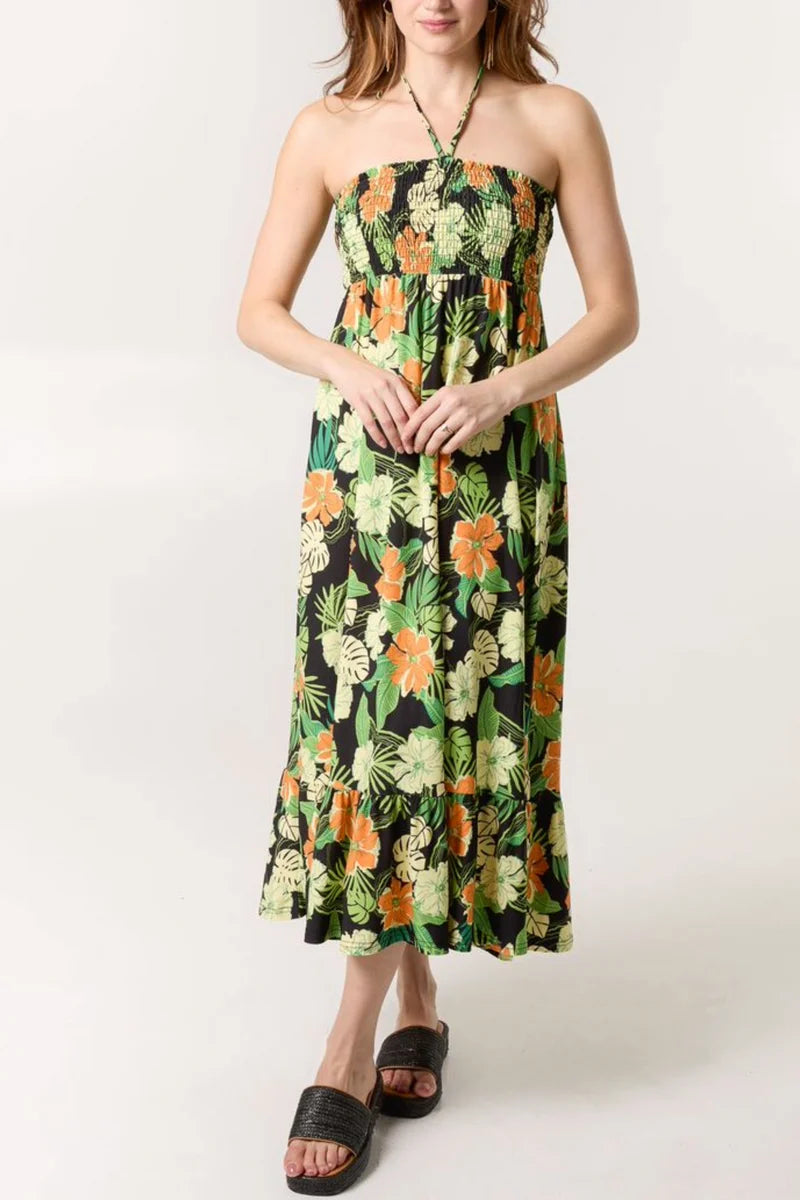 Tropical Floral Print Shirred Bandeau Dress